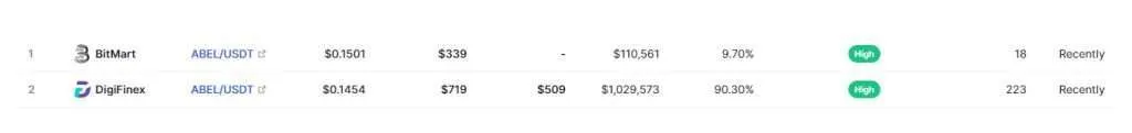 Tokens Can Be Purchased On Most Exchanges. One Choice To Trade Is On DigiFinex, As It Has The Highest ABEL/USDT. e Trading Volume, $8,947 As Of February 2021. Next is OKEx, With A Trading Volume Of $6,180,82. Other option To Trade Include ABEL/USDT And Huobi Global. Of Course, It Is Important To Note That Investing In Cryptocurrency Comes With A Risk, Just Like Any Other Investment Opportunity.