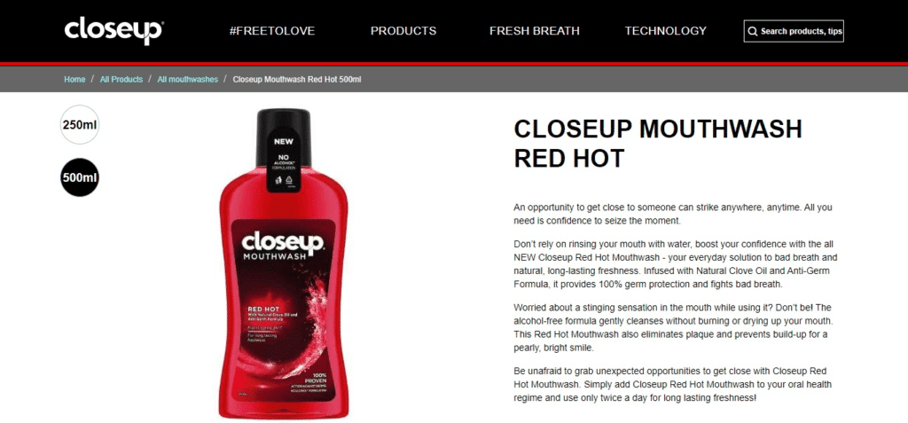 Closeup Red Hot Mouthwash is alcohol-free, making it suitable for individuals with sensitive gums or those looking for a gentler option. With its distinctive flavor and effective breath-freshening properties, Closeup Red Hot Mouthwash is a dynamic choice for those seeking a refreshing and confidence-boosting solution for bad breath.