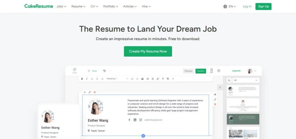 CakeResume, the Best Resume Maker App that flawlessly blends innovation and functionality, you can usher in a new era of resume production. CakeResume distinguishes itself with its aesthetically pleasing and easy platform, providing a seamless experience for creating distinctive and professional resumes. With the app’s variety of contemporary and editable templates, you can make sure your resume reflects your own style and keeps up with current design trends. CakeResume offers features like dynamic content ideas and personal branding options that boost your professional profile, going beyond just aesthetics.