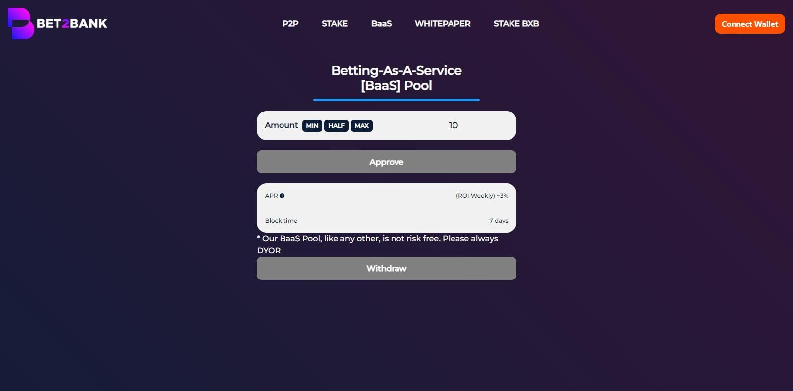 Bet2bank is a blockchain-based project that offers an innovative betting-as-a-service (BaaS) platform. It combines a peer-to-peer custom betting decentralized application (dApp) with traditional fixed odds sports bets and a USDC-BXB token staking pool, providing users with a comprehensive betting experience.