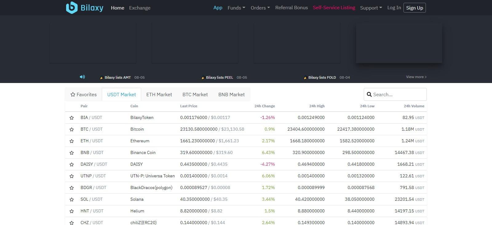 The Bilaxy exchange is a cryptocurrency trading service. You can trade Bitcoin, Ethereum, Litecoin, FXT Token, DRK Chain, Moonpot (BEP20), as well as over 300 altcoins and tokens on the platform. There are no fiat funds, only crypto-to-crypto pairs. They use the TradingView desktop trading terminal and an application for mobile trading based on the TradingView model. The app comes in versions for iOS and Android. There are no investment solutions, demo accounts, or training.