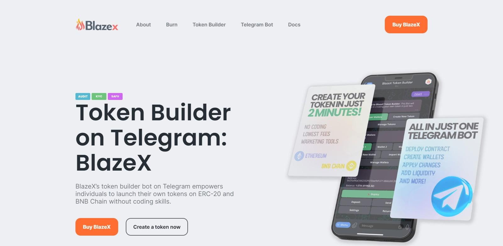 BlazeX automated token builder empowers individuals with or without coding skills to launch their own tokens on the ERC-20 and BNB Chain. This user-friendly Telegram Bot and DApp allows users to customize their tokenomics according to their specific requirements and preferences.