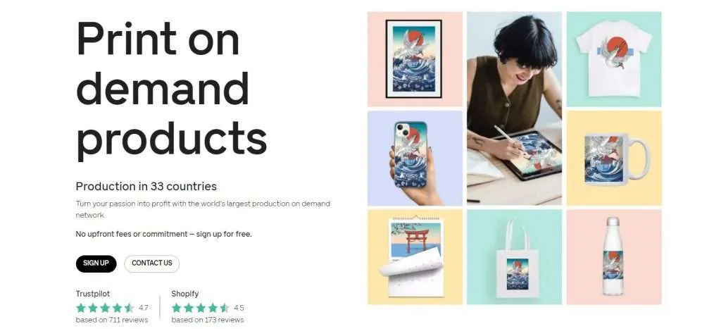 - Connect via Shopify – If you have an online store with Shopify, you can easily download your app and start producing your products. Design the products you want to sell from your product catalogue, and let handle the rest.