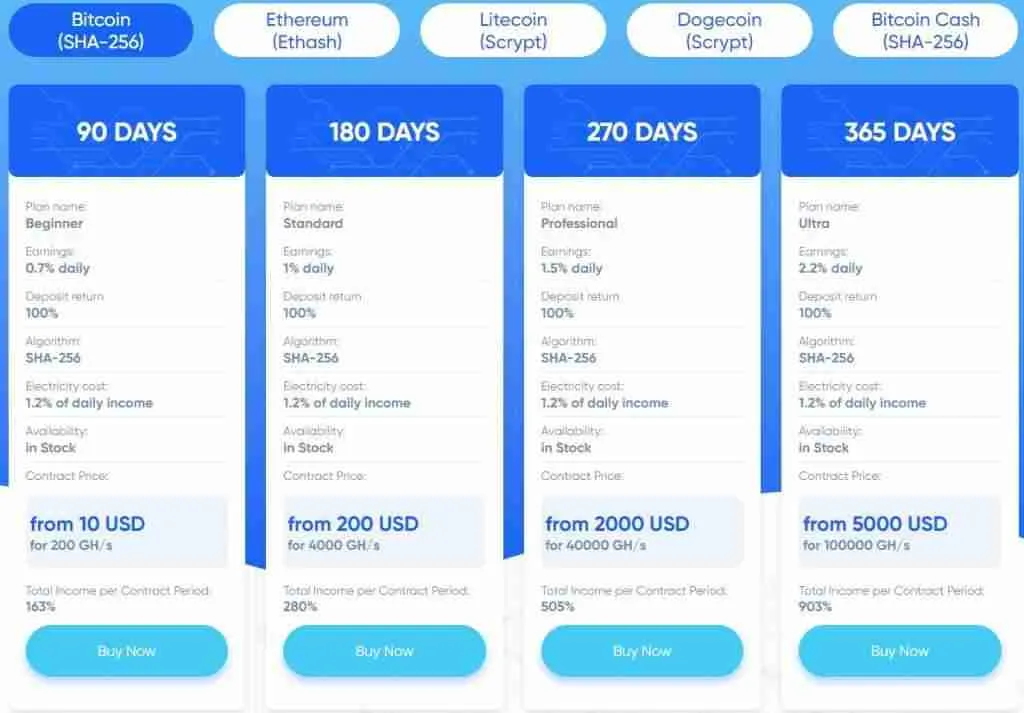 Mostly, Minexo Cloud Mining mine Bitcoin, which has the highest market price and capitalization. But our mining list also includes Litecoin, Ethereum, Bitcoin Cash, and Dogecoin.